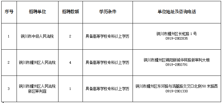 全市法院共招聘聘用制書記員7名,各法院招聘職位、地址及政策咨詢電話詳見《銅川法院2023年面向社會(huì)公開招聘聘用制書記員職位表》(附件)。